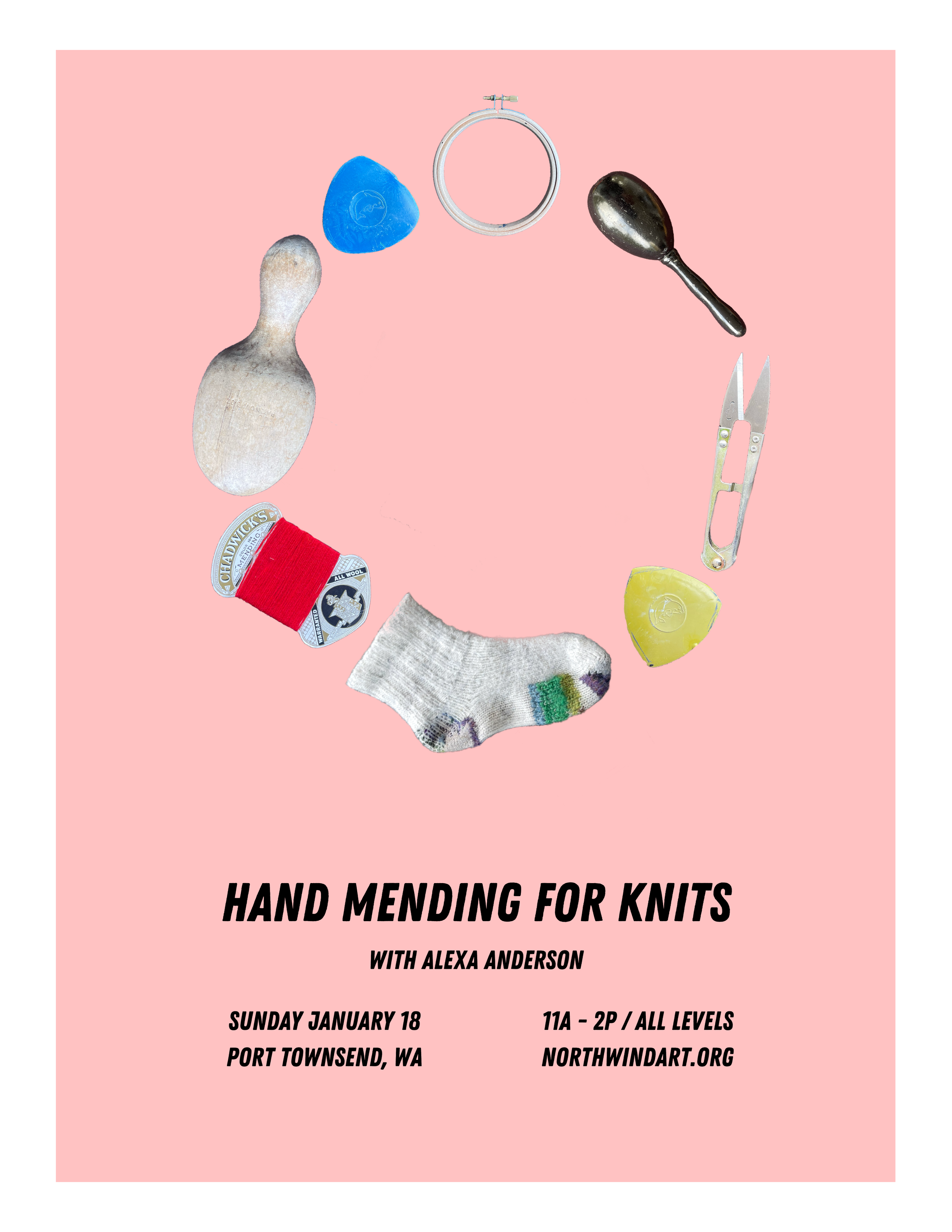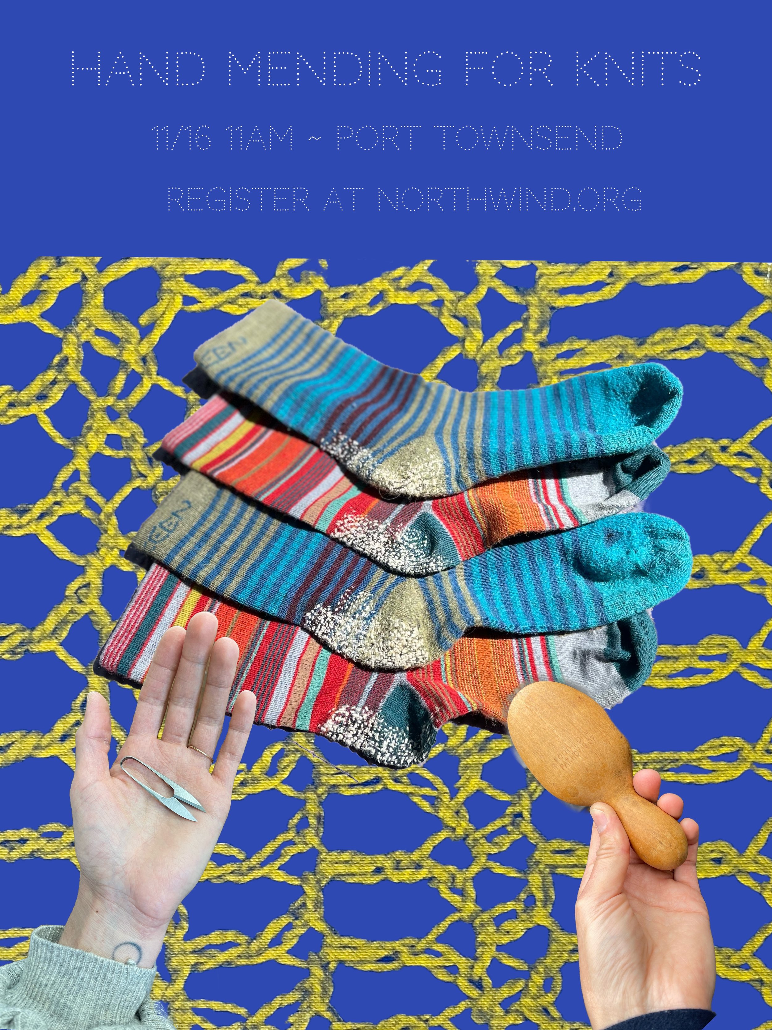 Join me at Northwind Arts in Port Townsend, Washington and learn to repair your cold-weather knitwear by hand. Together we'll darn our sweaters, socks, and delicate wool base layers. We’ll be focusing on hand-sewing and visible mending techniques.